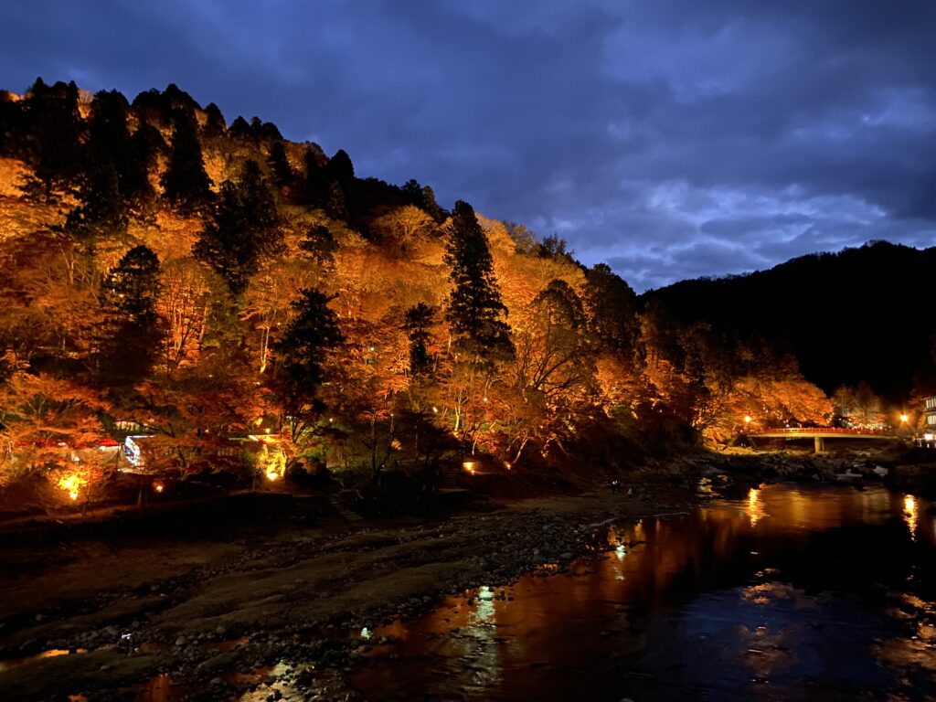 香嵐渓ライトアップは、巴川沿いの紅葉が水面に映り込む“二重のもみじ”が幻想的で圧倒的な美しさ。