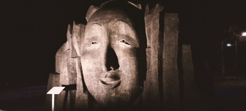 ここでは名物になりつつある「怖い顔岩のライトアップ」が迫力満点!