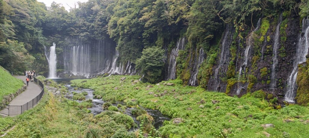 富士山の湧水が何本もの“糸”になって落ちる、静かで美しいタイプの滝。