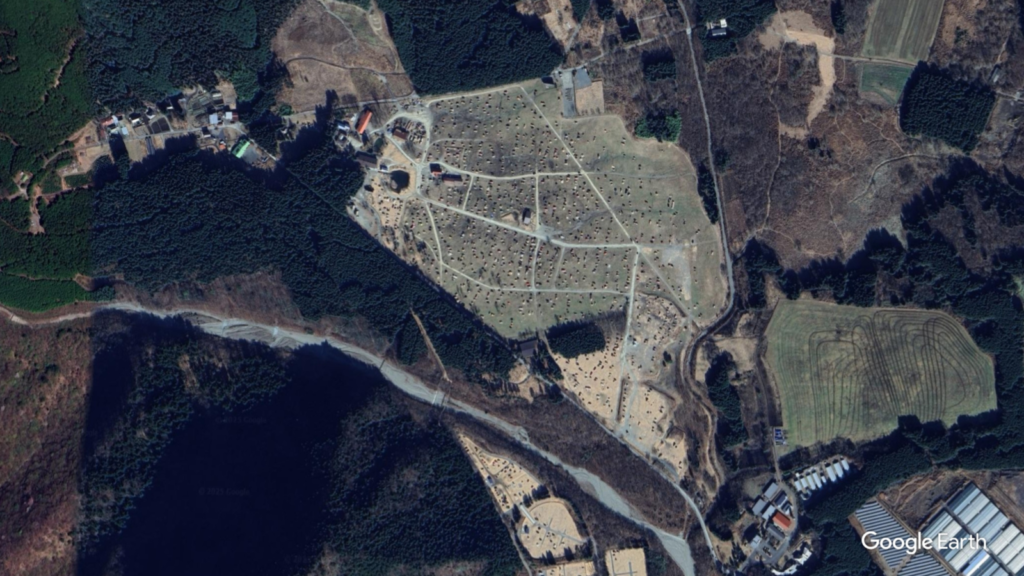 上空から見るふもとっぱらはスケールが段違いで、「ここ全部サイト?」と驚く広さ。