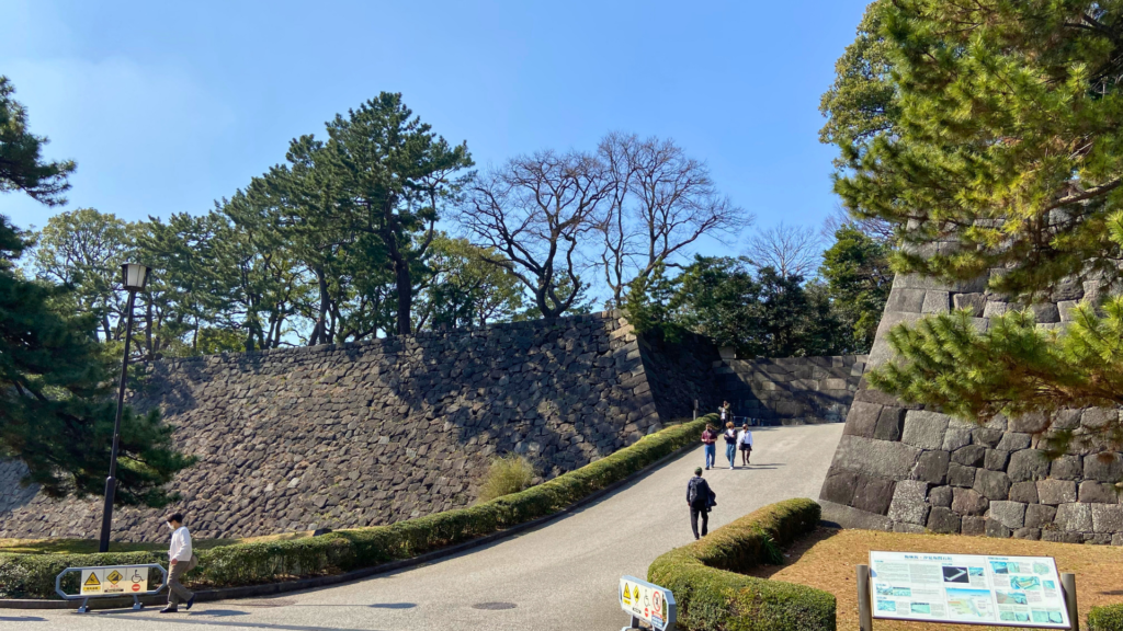 江戸城跡の大きな石垣と坂道を写した写真。天守のない城の特徴が分かる構図 観光地